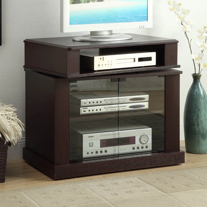 Transitional Cherry TV Cabinet with Swivel & Storage Elevate your home entertainment with the 4D Concepts Transitional Cherry TV Cabinet. Designed to accommodate TVs under 32 inches, this stylish and functional piece offers ample storage and mobility,