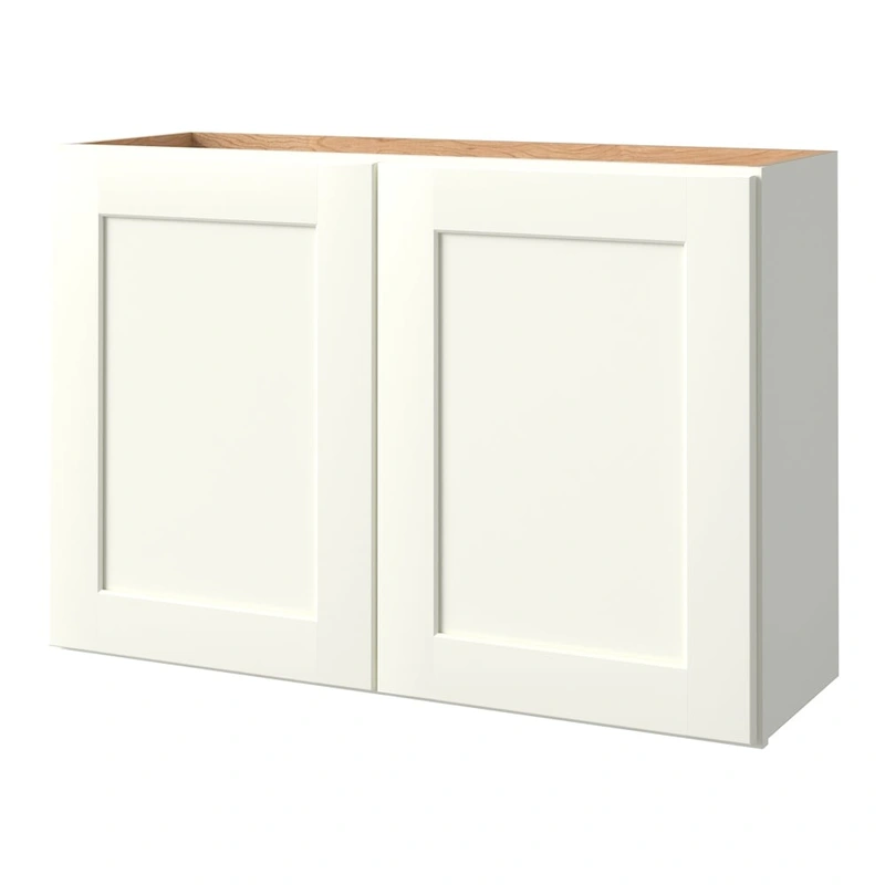 Aveley 36-in Linen Wall Cabinet The allen + roth Aveley Wall Cabinet combines elegance and practicality, featuring a bright, true painted white finish with flat panel Shaker doors for a modern look. Its full overlay doors and TuffTech-coated interior ensur