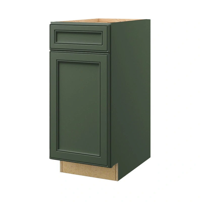 Heathrow Sage Green Base Cabinet Transform your space with the Heathrow Base Cabinet in a calming Sage green finish. Fully assembled and designed with a recessed panel mitered style, this cabinet ensures both style and functionality with its soft-close fea