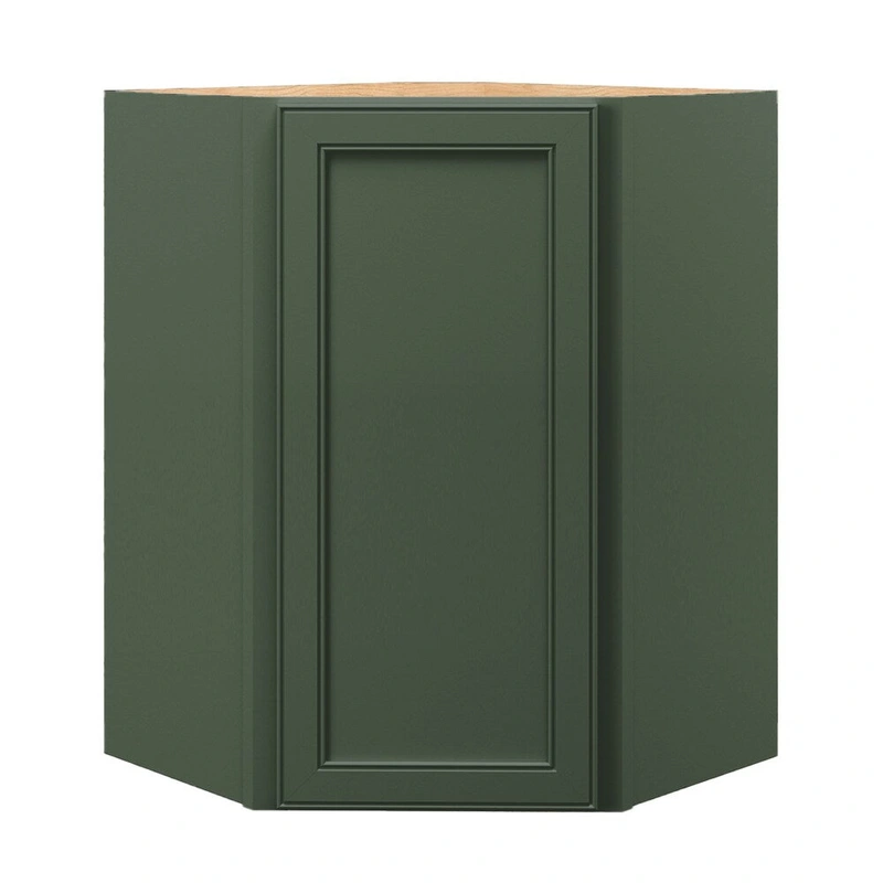 The Heathrow Sage Diagonal Corner Wall Cabinet transforms your kitchen or bathroom into a serene haven. Its recessed panel design, coupled with the calming Sage finish, enhances any corner with understated elegance. Embellish it with copper or black hardware to create a bold contrast, or let it stand alone, basking in its rich, earthy tones. Perfect for adding personality and utility, this cabinet harmonizes form and function, making luxury accessible and cozier than ever.