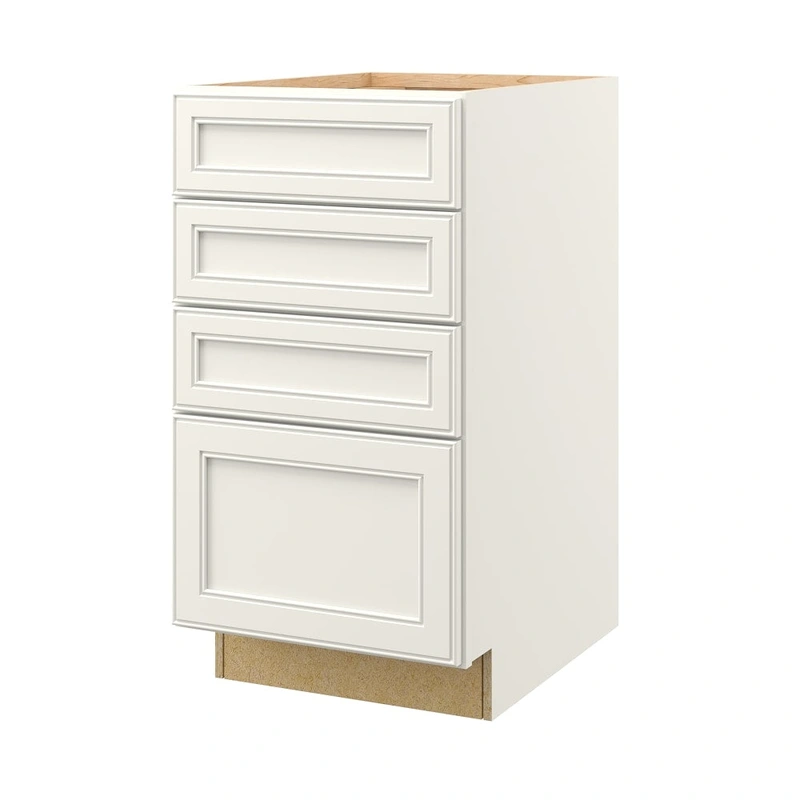The McKeller Linen 4-Drawer Base Cabinet by allen + roth offers a sophisticated storage solution with its crisp white finish and transitional design. Meticulously crafted for durability and style, this cabinet comes fully assembled with soft-close drawers and seamless flat panel doors, making it perfect for modern kitchens.
