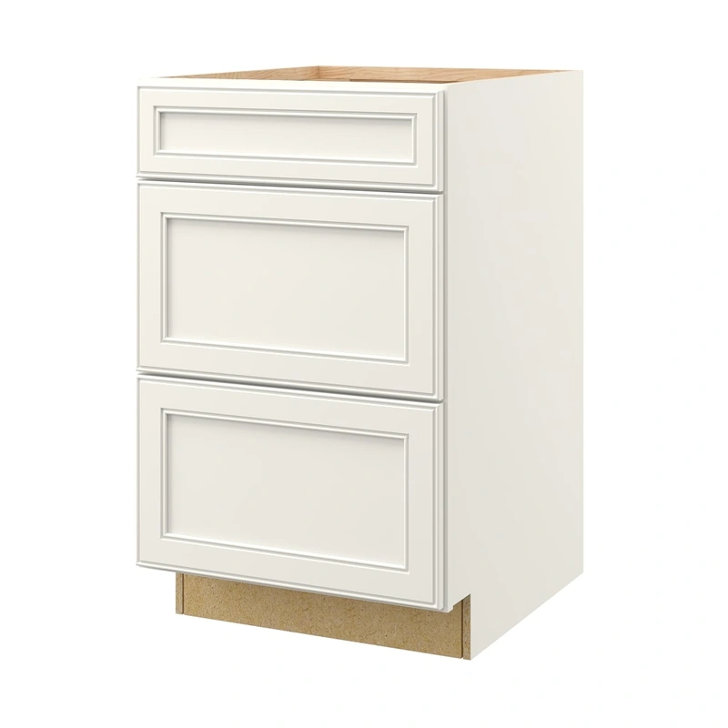 McKeller Linen 3-Drawer Base Cabinet The McKeller Linen 3-Drawer Base Cabinet brings modern elegance and functional storage to your space with its flat panel style. Designed with a true painted finish that combines hardwood and engineered materials, it off