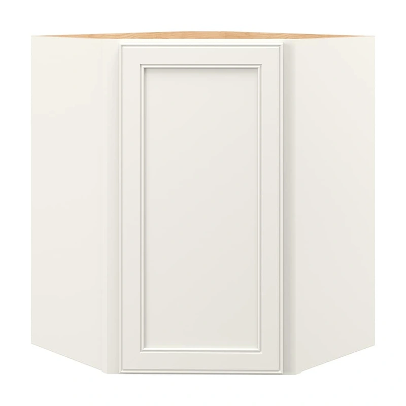 The allen + roth McKeller Linen Corner Wall Cabinet adds a touch of elegance to any space with its flat panel design and crisp, linen finish. With durable construction that blends hardwoods and engineered materials, this cabinet features soft-close doors and adjustable shelving for functional convenience, making it an ideal choice for modern kitchens.