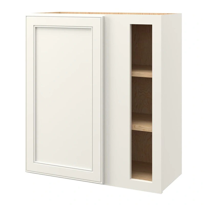 The allen + roth McKeller Linen Blind Corner Wall Cabinet delivers refined style and remarkable functionality with its elegant flat panel mitered design. Incorporating soft-close technology, it’s a perfect addition to modern kitchens aiming for seamless integration and practical storage solutions.