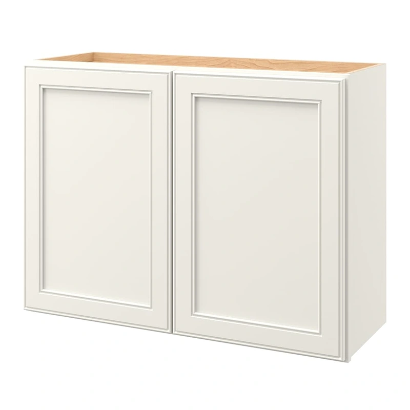 The McKeller Linen Wall Cabinet by allen + roth offers an elegant storage solution for modern kitchens, featuring a crisp white finish that complements any dcor. Built with a blend of hardwoods and engineered materials, it provides superior durability and seamless style with its flat panel square door design. Installed fully assembled, this cabinet combines aesthetics with functionality, making it a perfect fit for your home improvement project.