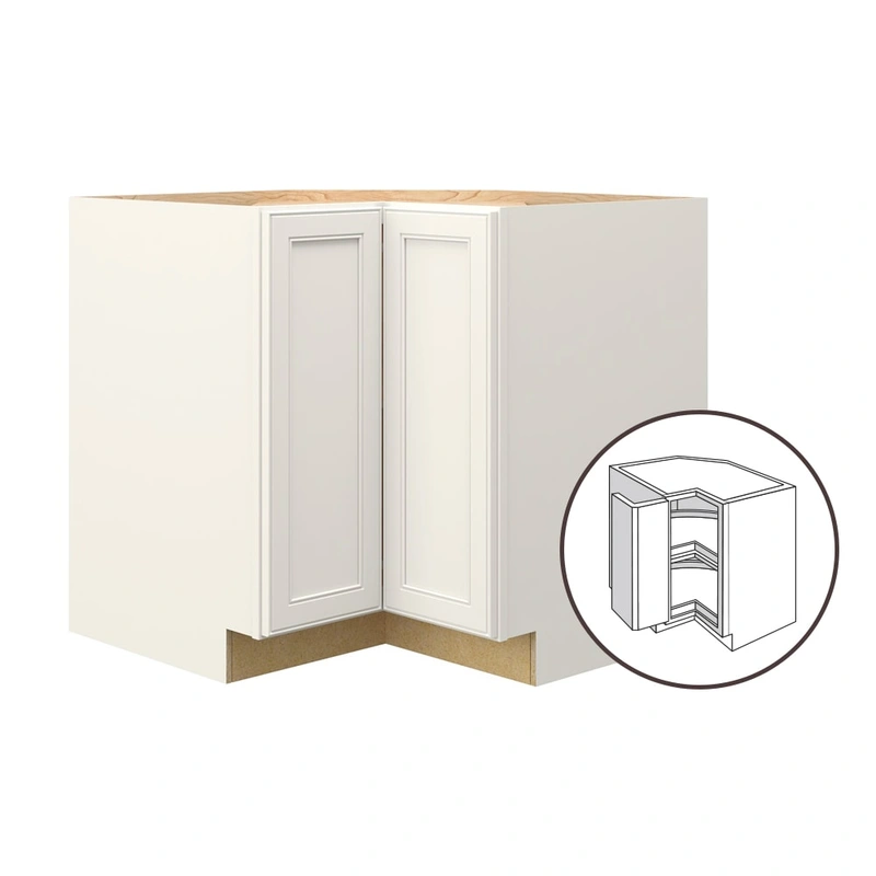 McKeller Linen Lazy Susan Corner Base Cabinet The McKeller Linen Lazy Susan Corner Base Cabinet by allen + roth offers both elegance and efficiency, with a stunning painted finish on durable wood and MDF. Its 170-degree door swing and Lazy Susan design max