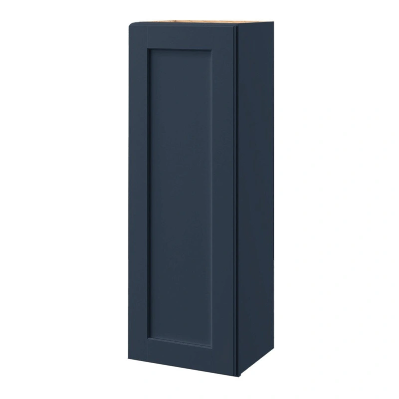 Navy Wall Cabinet with Soft-Close Doors Upgrade your space with the allen + roth Port Navy Wall Cabinet, featuring a timeless flat panel square door style. Designed with superior durability, it offers a seamless blend of wood and engineered materials for a