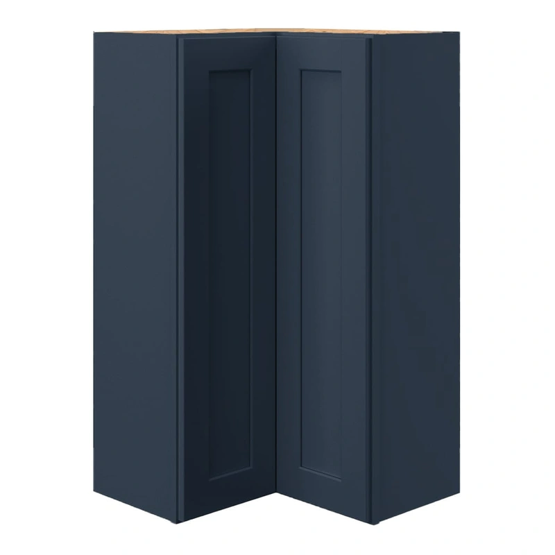 Navy Diagonal Corner Shaker Wall Cabinet Enhance your space with the allen + roth Port 24" Navy Diagonal Corner Wall Cabinet, offering a fully assembled, shaker-style design. This sturdy cabinet beautifully combines hard woods and engineered materials, del