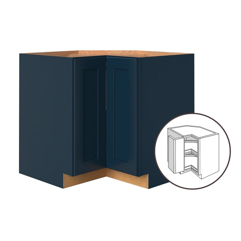 Navy Lazy Susan Corner Base Cabinet Elevate your kitchen's functionality and style with the allen + roth Navy Lazy Susan Corner Base Cabinet. Featuring a modern flat-panel Shaker design, this cabinet is fully assembled for easy installation and offers supe