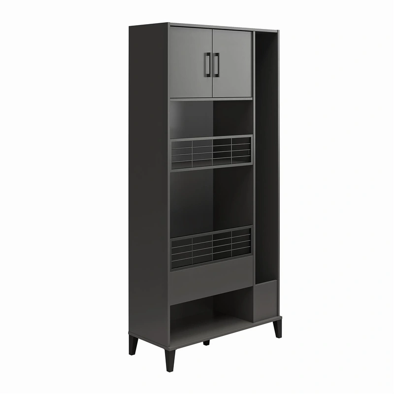 Amplus Graphite Utility Storage Cabinet Keep your home streamlined and organized with the Amplus Utility Storage Cabinet in Graphite. Designed with durable engineered wood and powder-coated metal, this freestanding cabinet features ample compartments and a