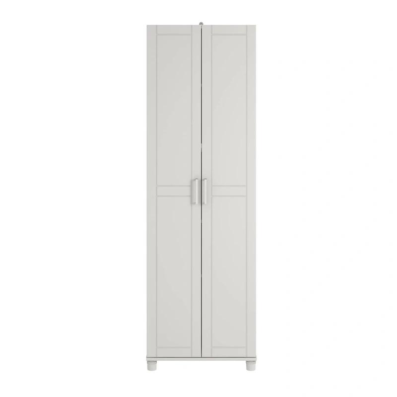 Callahan Freestanding White Garage Cabinet Maximize your storage space with the Ameriwood Home Callahan Freestanding Garage Cabinet. Designed with laminated MDF and particleboard, it offers a water-resistant white finish for easy cleaning. The cabinet feat