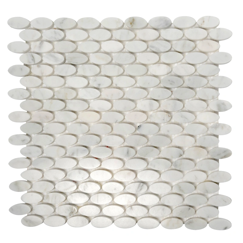 Athens White Polished Marble Mosaic Sample Transform spaces with the Athens White Circular Mosaic Wall Tile Sample. Crafted from polished marble, this sample showcases a timeless, luxurious pattern, highlighting its potential to add subtle geometric flair