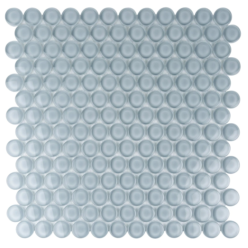 Light Gray Glossy Glass Penny Round Tile Sample Elevate your space with the Apollo Tile Sample in Light Gray, a glossy penny round mosaic tile that seamlessly blends retro charm with modern sophistication. Perfect for testing in various settings, this glas