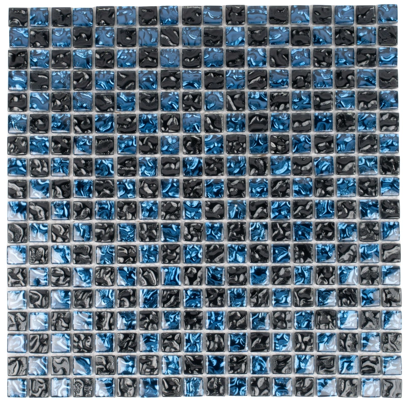 Elaina Blue & Black 4x4 Glass Mosaic Tile Sample Transform your space with the Elaina Blue and Black Glossy Glass Mosaic Tile. This 4x4 inch sample exudes timeless elegance with a modern twist, perfect for testing in any room. Its glossy finish enhance