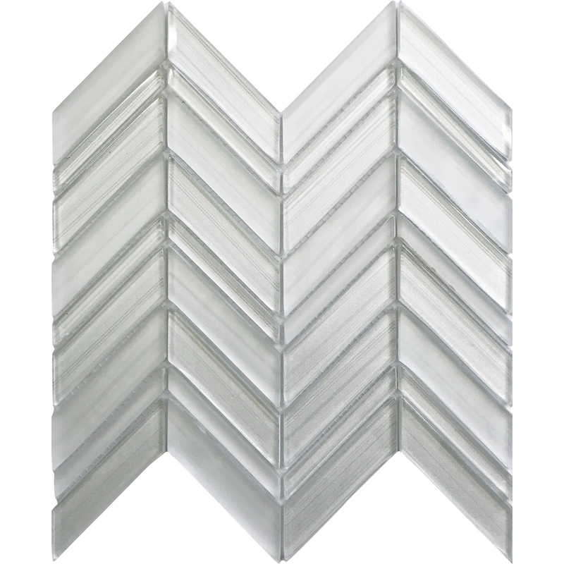 Glacier Pearl Chevron Glass Tile Sample Elevate your design project with the modern elegance of Glacier Pearl Chevron Glass Tile. This polished glass mosaic features a stunning chevron pattern, offering a timeless blend of sleek surfaces and vintage charm.