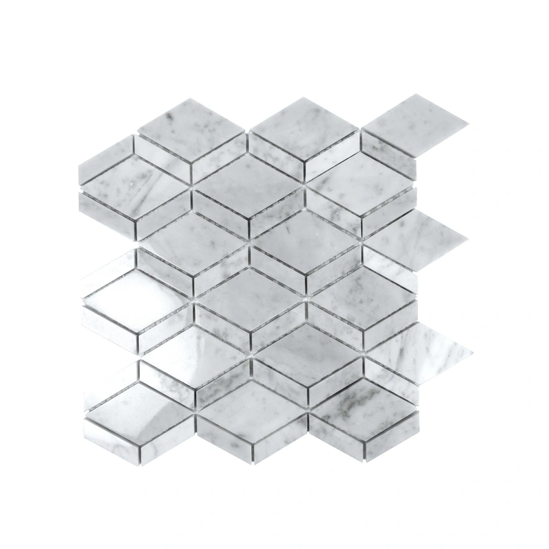 Enhance your space with the unparalleled elegance of Carrara marble in a modern diamond mosaic tile. This sample showcases the intricate veining and sophisticated style ideal for varied interior applications, providing a timeless look that adds character to walls, floors, and backsplashes.