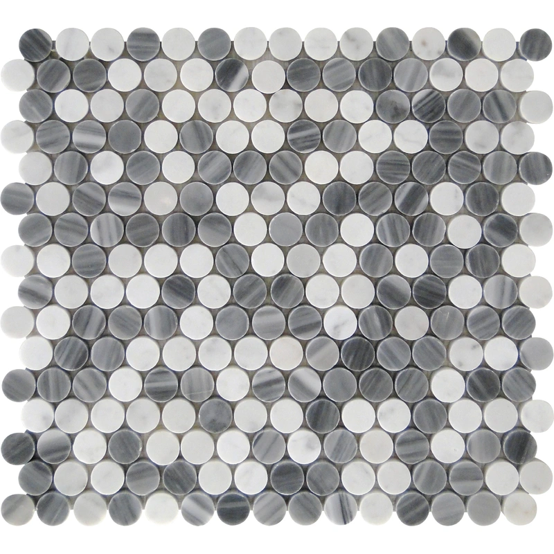 Apollo Gray & White Marble Penny Round Tile Sample Bring an elegant and timeless touch to your home with the Apollo Gray & White Marble Penny Round Tile Sample. These polished marble tiles offer a classic penny round pattern that's perfect for wall
