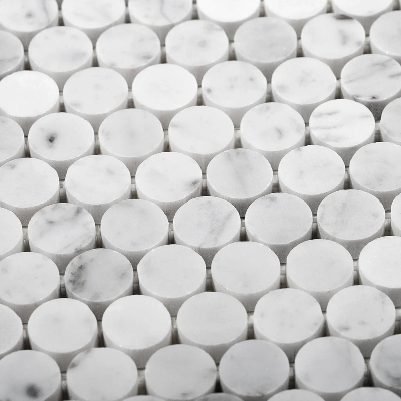 Order your Apollo White Marble Penny Round Mosaic Tile sample today to envision its timeless elegance in your space!