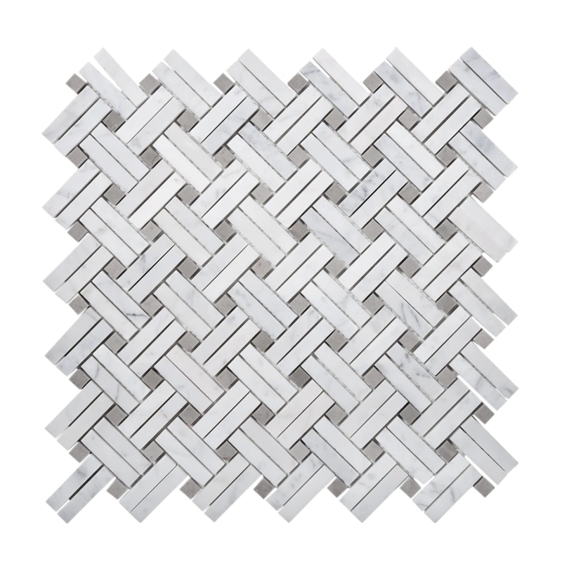 Experience the sophisticated elegance of the Apollo Basketweave Marble Look Tile. This polished glass, metal, and stone tile offers a stunning marble appearance perfect for enhancing any floor or wall with its timeless design.