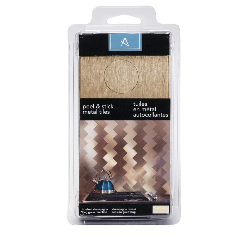 Champagne Peel & Stick Metal Backsplash Tiles - 8 Pack Transform your space with the Aspect 3" x 6" Champagne Peel & Stick Brushed Metal Long Grain Backsplash Tiles. These elegant tiles offer a sleek metal finish that effortlessly enhances your kit