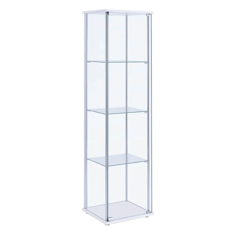 Clear and White Metal Curio Cabinet This contemporary clear and white metal curio cabinet combines modern elegance with functionality, offering four spacious glass shelves to beautifully display your cherished items. Crafted from durable metal and clear gl