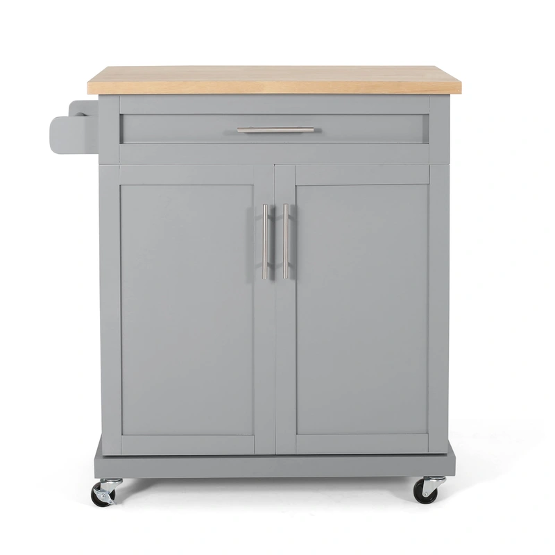 Gray MDF Rolling Kitchen Cart Elevate your kitchen's functionality and style with this Gray MDF Rolling Kitchen Cart. Designed with a sleek particleboard veneer top and a sturdy manufactured wood frame, this cart adds valuable storage and prep space to any
