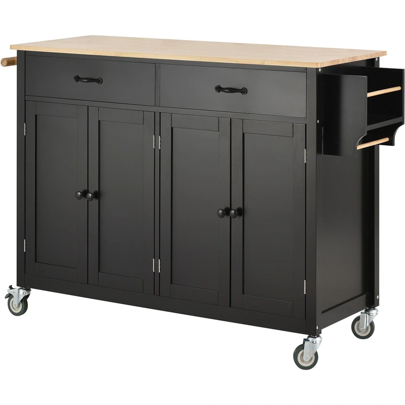 Bybafun Black Rolling Kitchen Cart Transform your kitchen with the Bybafun Black Rolling Kitchen Cart, featuring a sleek MDF base with a durable wood top. This mobile island offers ample storage with cabinets and drawers, making it a stylish and practical