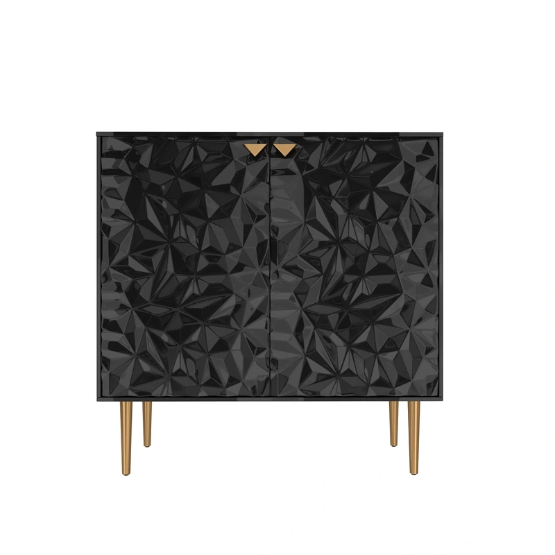 Experience the transformative power of the Clihome Black Utility Storage Cabinet, where elegance meets utility. The striking raised diamond pattern on the sleek black doors is complemented by slender, polished brass legs, infusing an air of sophistication into any room. Use it to stylishly conceal clutter while adding a touch of glamour to your dcor. Whether placed against a timeless brick wall or amidst a sleek, modern environment, this cabinet stands as a testament to the luxury of thoughtful design.