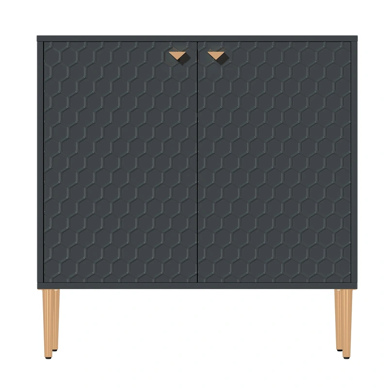A: The cabinet is crafted from MDF with elegant gold-painted metal legs and pulls.