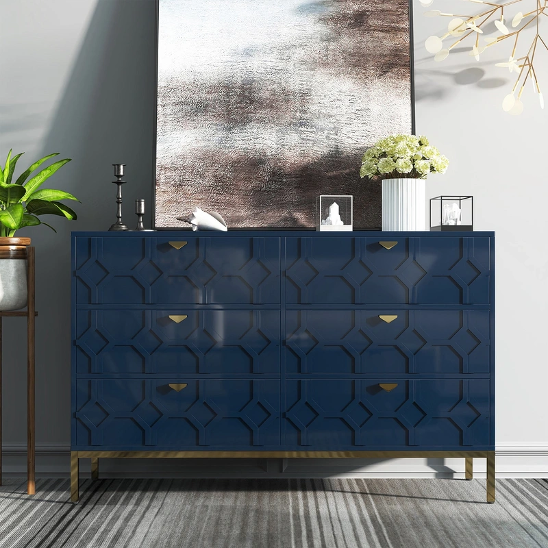 Elevate your bedroom or living room with the Clihome Blue 6-Drawer Accent Chest. This sophisticated storage solution combines a modern aesthetic with practical features, including a stunning honeycomb pattern and adjustable foot pads for stability. The deep blue finish complements the tapered gold metal legs, adding a touch of elegance to any space.