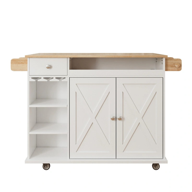 Rolling Kitchen Cart with MDF Base and Top Maximize your kitchen or dining room space with the Damerin Rolling Kitchen Cart, featuring a sleek white MDF base and wooden top. This versatile mobile island offers adjustable shelves, a wine rack, and multiple