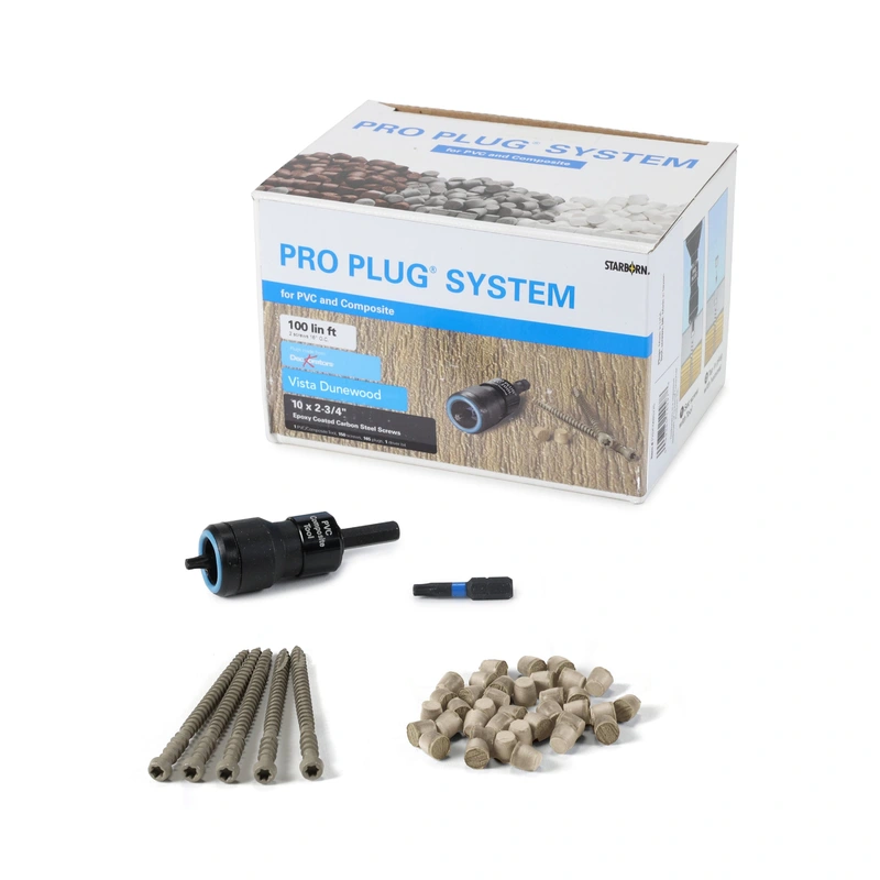 A: The system’s standout feature is the genuine composite material used for plugs, ensuring they match your decking perfectly, alongside the epoxy-coated screws for durability.