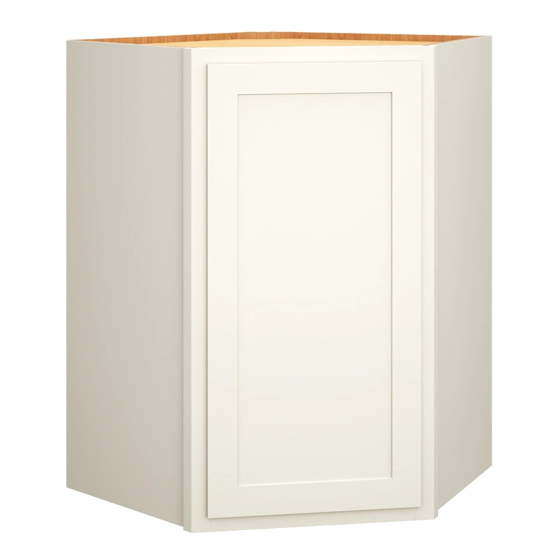 Jamestown 36" White Diagonal Corner Cabinet The Jamestown 36-in White Diagonal Corner Wall Cabinet is your perfect solution for maximizing corner space in kitchens or bathrooms. Featuring all-plywood construction and soft-close doors, this cabinet combines