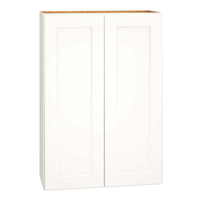 Macaulay 27-in x 39-in White Plywood Wall Cabinet The Macaulay Wall Cabinet combines elegance with durability, featuring an exquisite white painted finish on a robust all-plywood construction. Its soft-close, recessed panel doors offer a refined touch, per
