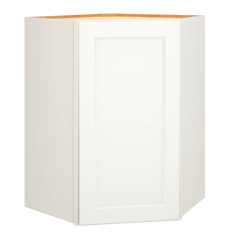 Macaulay 36" x 36" White Corner Wall Cabinet The Macaulay White Diagonal Corner Wall Cabinet is a premium addition to any kitchen or living space, adding functionality with style. Crafted from all-plywood construction, it features a stunning recessed panel
