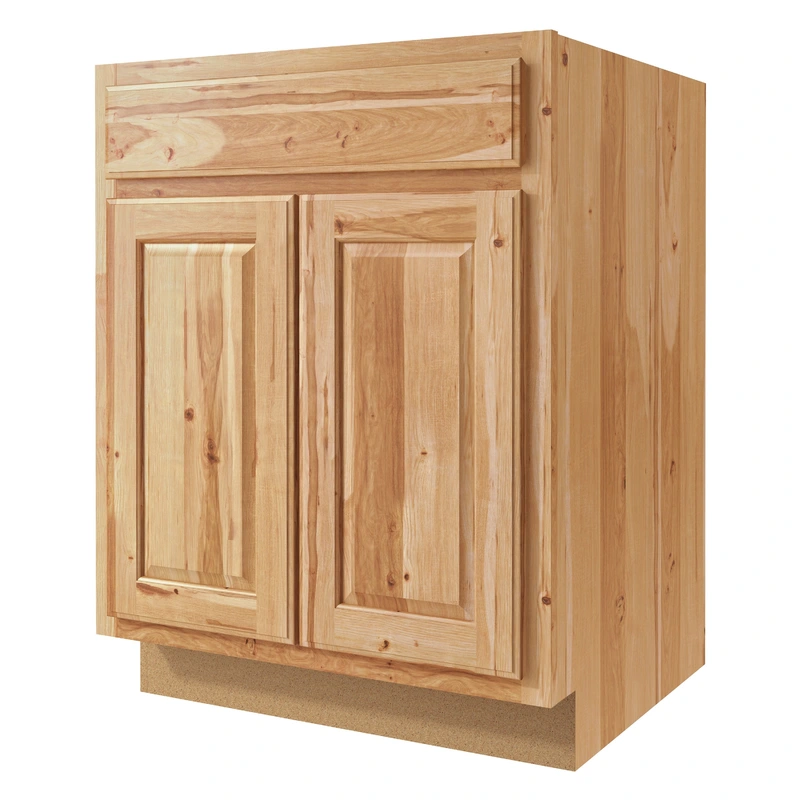 Rustic Hickory 1-Drawer Base Cabinet Elevate your space with the Diamond NOW Denver base cabinet, exuding rustic charm through its natural hickory wood. This fully assembled, durable cabinet features a raised panel design, blending style and functionality