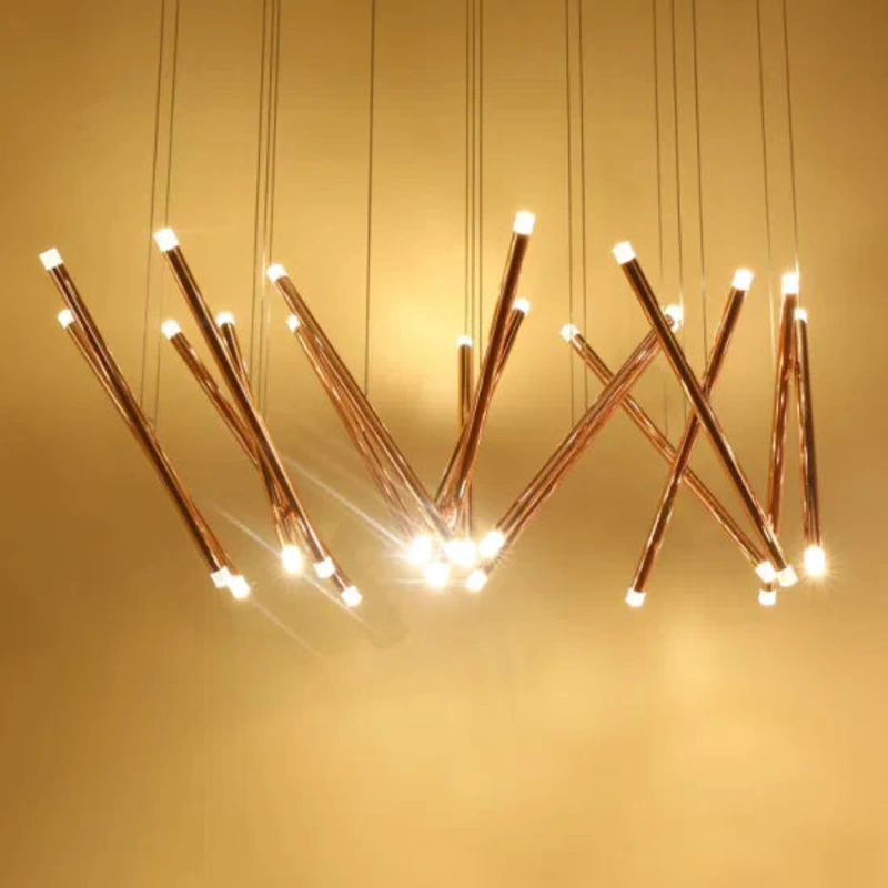 Modern LED Water Pipe Chandelier Illuminate your space with the Modern LED Water Pipe Chandelier, a striking piece combining industrial flair with modern elegance. This copper-finished chandelier is crafted with aluminum, iron, and acrylic, making it not o