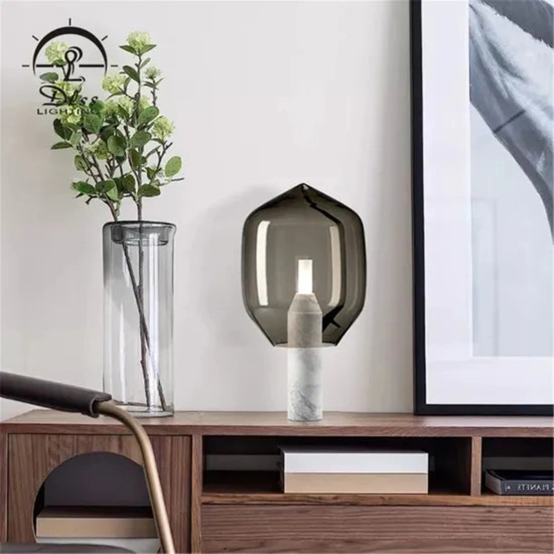 Smoky Modern G9 Table Lamp Illuminate your space with the Smoky Modern G9 Table Lamp, featuring a striking design with a smoky glass shade and a robust black marble base. This contemporary piece marries fine materials with sleek aesthetics, perfect for enh