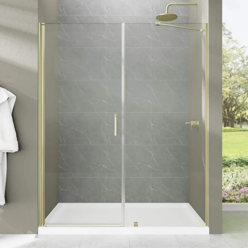 Brushed Gold Semi-Frameless Pivot Shower Door Experience modern elegance in your bathroom with EAKYHOM's 56-60 in. W x 72 in. H Pivot Semi-Frameless Shower Door. Featuring clear tempered glass and a brushed gold finish, this shower door combines style and