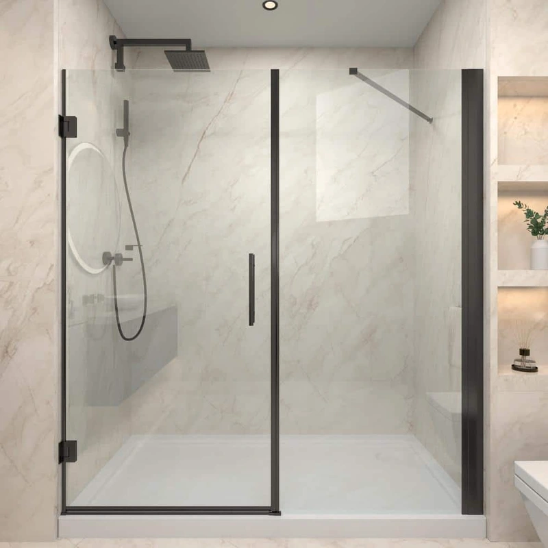 Upgrade your bathroom with the EAKYHOM Pivot Semi-Frameless Shower Door. Its sleek matte black finish and premium tempered glass create a modern aesthetic while ensuring durability and easy maintenance. This door seamlessly combines style and functionality, making it an ideal addition to any contemporary bathroom.