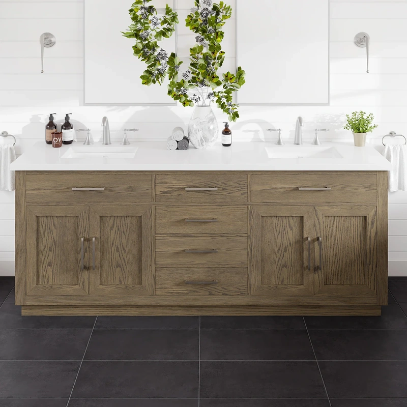 Be the first to review “Eviva Abbington 84″W x 22″D Gray Oak Double Sink Bathroom Vanity with White Cultured Marble Countertop and Undermount Porcelain Sinks”