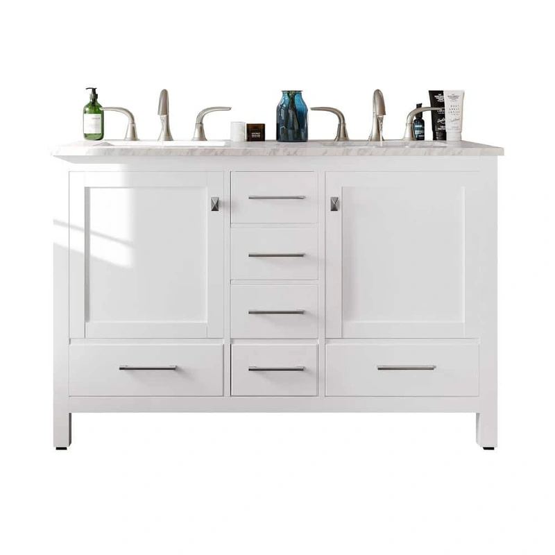 Eviva Aberdeen Double Bath Vanity - White The Eviva Aberdeen Double Bath Vanity offers a harmonious blend of elegance and utility. Featuring a distinguished white Carrara marble top, this 48-inch wide, fully assembled vanity is ready to elevate your bathro