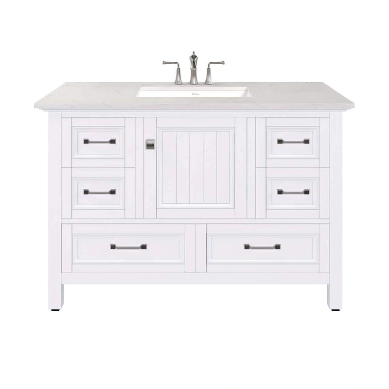 Eviva Britney 42" Bathroom Vanity The Eviva Britney 42" Bathroom Vanity combines timeless elegance with practicality, featuring a lustrous Carrara quartz top and a seamless undermount porcelain sink. Its durable solid wood construction and soft-close drawe