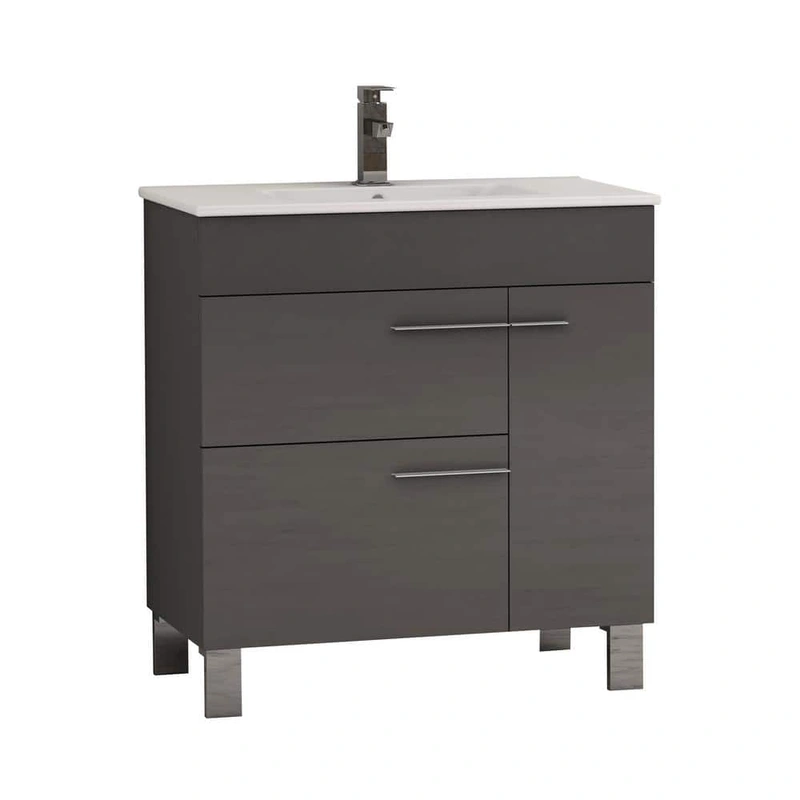Eviva Gray Bath Vanity with Ceramic Top & Sink Transform your bathroom into a sleek modern retreat with the Eviva Cup 31.5-inch Bath Vanity. Featuring an integrated white ceramic top with a durable eco-friendly engineered wood base, this vanity combine