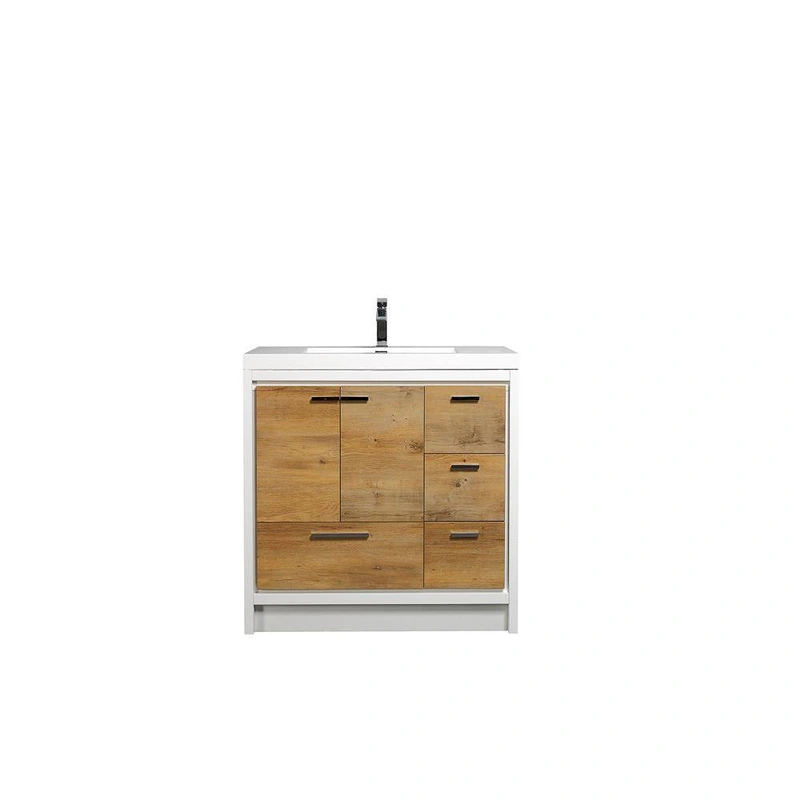 The Eviva Grace Bathroom Vanity in Natural Oak combines luxury with functionality, offering sleek design and ample storage. Its white acrylic top and integrated sink enhance the elegance of any space, while soft-closing drawers ensure quiet convenience.