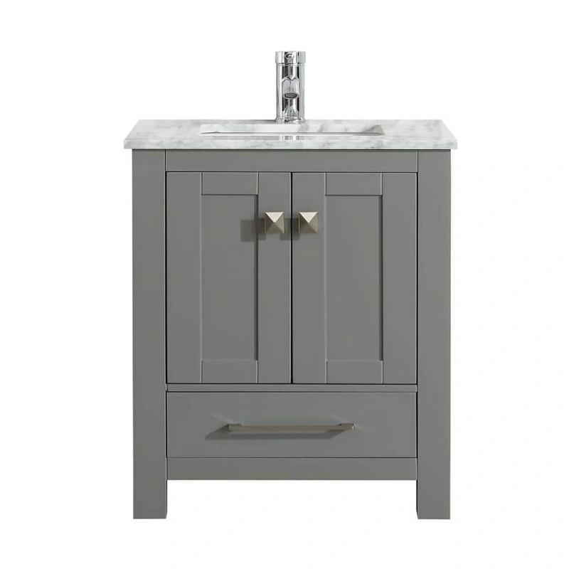 Eviva London Gray Bathroom Vanity The Eviva London Gray Bathroom Vanity combines elegant design with practical functionality, featuring a solid wood structure and a luxurious White Carrara Marble top. Its compact 18-inch depth maximizes storage with soft-c