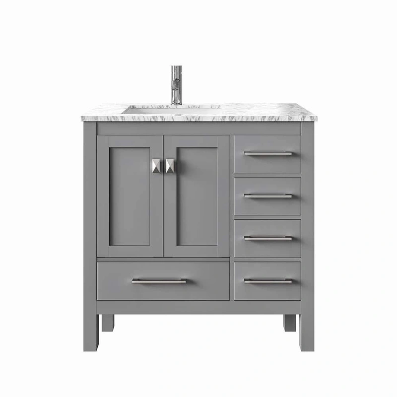 Eviva London 38" Gray Bathroom Vanity The Eviva London Bathroom Vanity brings sophistication and ample storage to compact bathrooms, featuring a modern gray finish with a luxurious White Carrara Marble Top and integrated porcelain sink. Its solid wood cons