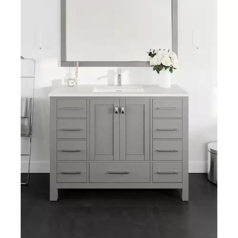 Eviva London 42" Bath Vanity with Marble Top Redefine your bathroom decor with the Eviva London 42-inch Bath Vanity, showcasing a sophisticated gray finish paired with a luxuriously smooth White Carrara Marble countertop. This freestanding vanity combines