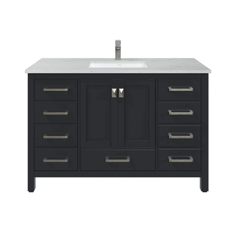 The Eviva London 48″ Bathroom Vanity combines sleek design with functional elegance. Featuring a rich espresso finish and a pristine White Carrara Quartz top, this piece is crafted from solid wood for durability and offers a spacious single sink format perfect for modern spaces.