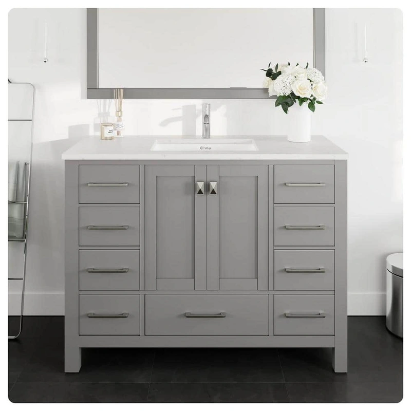 Eviva London 48" Gray Bath Vanity Transform your bathroom with the elegant Eviva London 48" Bath Vanity. Made of high-grade solid wood, it features a stunning stain-resistant White Carrara Quartz top and an undermount porcelain sink, ensuring luxury and du
